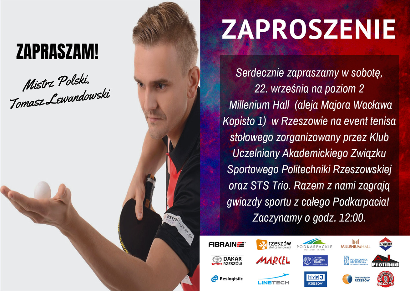 Politechnika Rzeszowska zaprasza na wydarzenie sportowe, które odbędzie się w sobotę, 22 września w Millenium Hall. Ma ono na celu promocję Klubu Uczelnianego AZS i Centrum Fizjoterapii i Sportu, tenisa stołowego oraz zdrowego stylu życia.